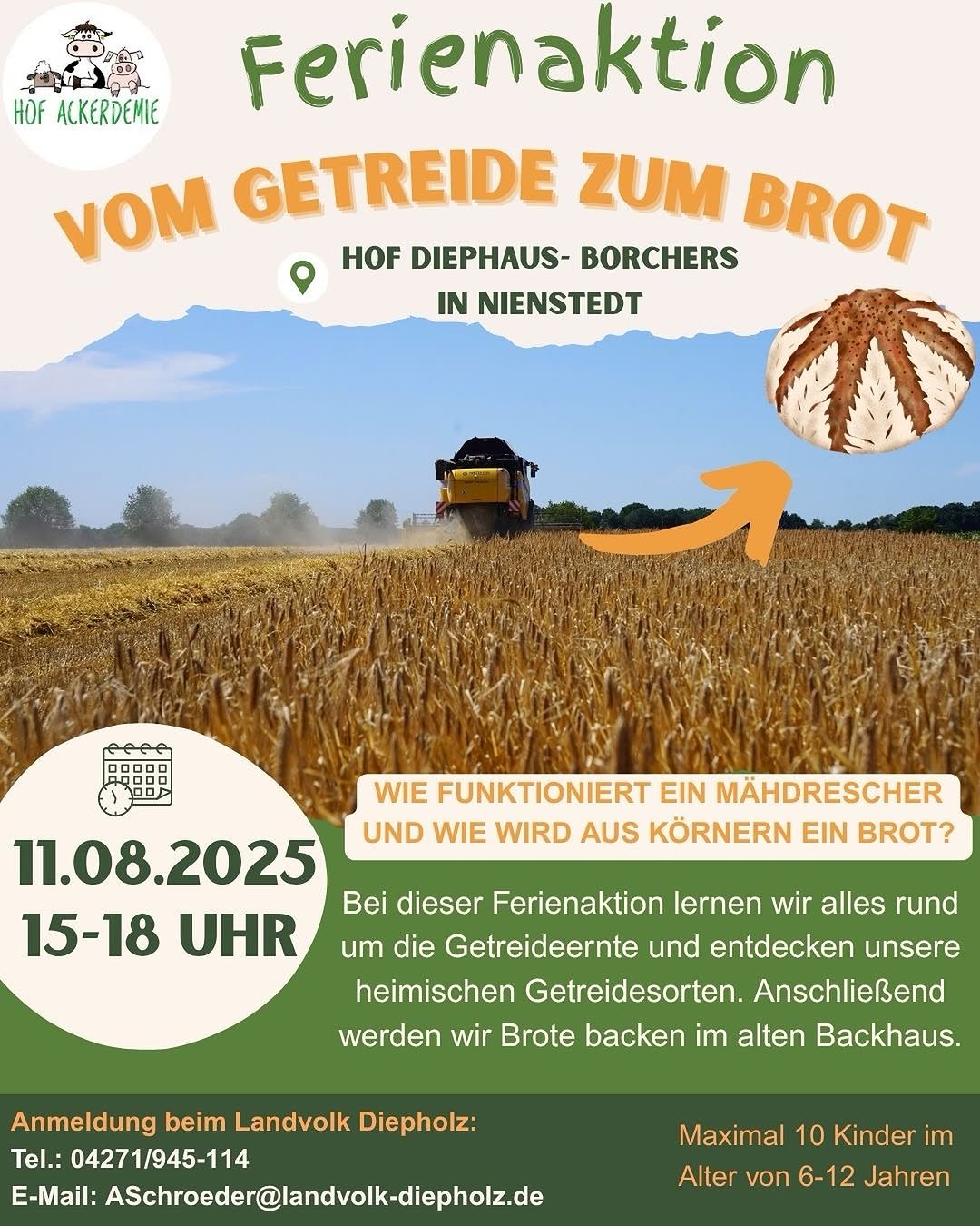 Vom Korn zum Brot – Kinder von 6 bis 12 Jahren erleben hautnah, wie aus Getreide leckere Brote werden! Gemeinsam ernten, mahlen & backen, im Rahmen der Hof Ackerdemie vom Landvolk Diepholz.