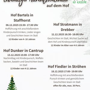 Hofführung mit anschließendem Glühwein/Kinderpunsch trinken und Geschichten im Stall Kommt vorbei und genießt einen stimmungsvollen späten Nachmittag auf dem Hof Fiedler!Wir starten mit einer gemütlichen Hofführung, bei der du unsere Tiere kennenlernen und einen besonderen Einblick in das Hofleben bekommst. Im Anschluss machen wir es uns gemeinsam  im Stall gemütlich: Wir lesen Geschichten, können Lieder […]